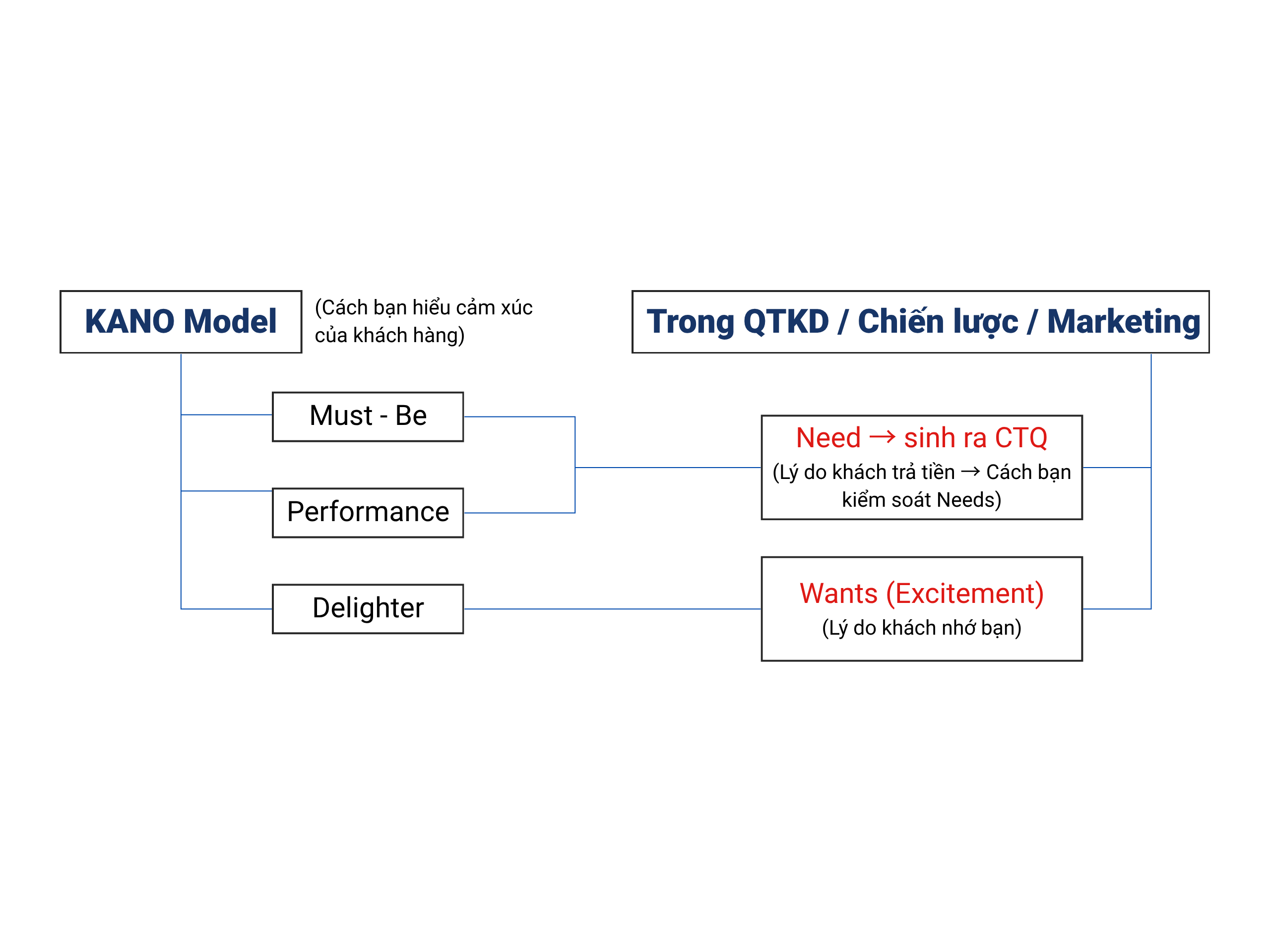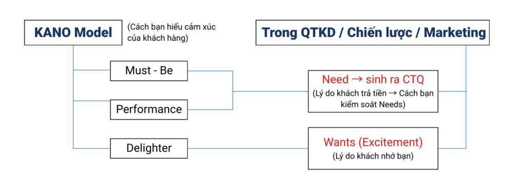 C) Sơ đồ quan hệ giữa “Loại nhu cầu Kano” và “Needs: nhu cầu – Wants: mong đợi” trong QTKD/ Marketing